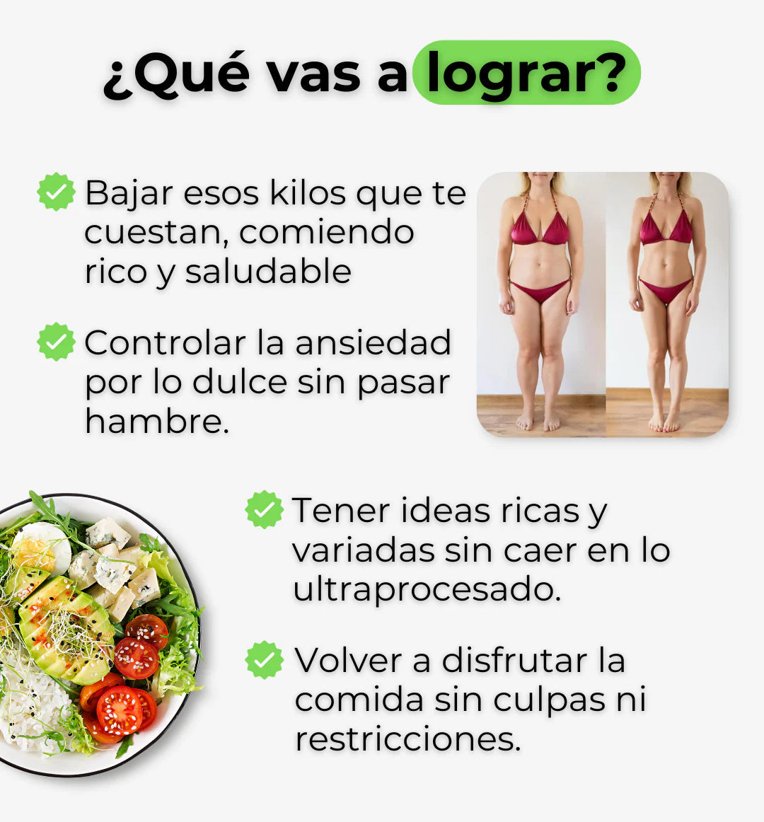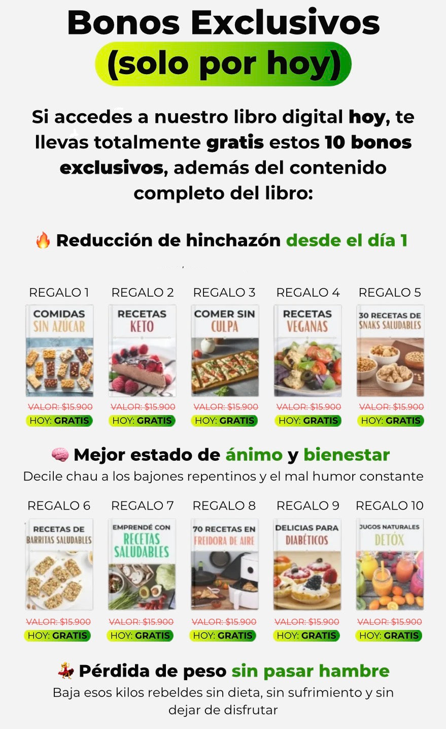 Incluye más de 1000 recetas naturales, guías de bienestar, 10 bonus exclusivos y más sorpresas para equilibrar tus hormonas, mejorar tu energía y sentirte liviana desde adentro.